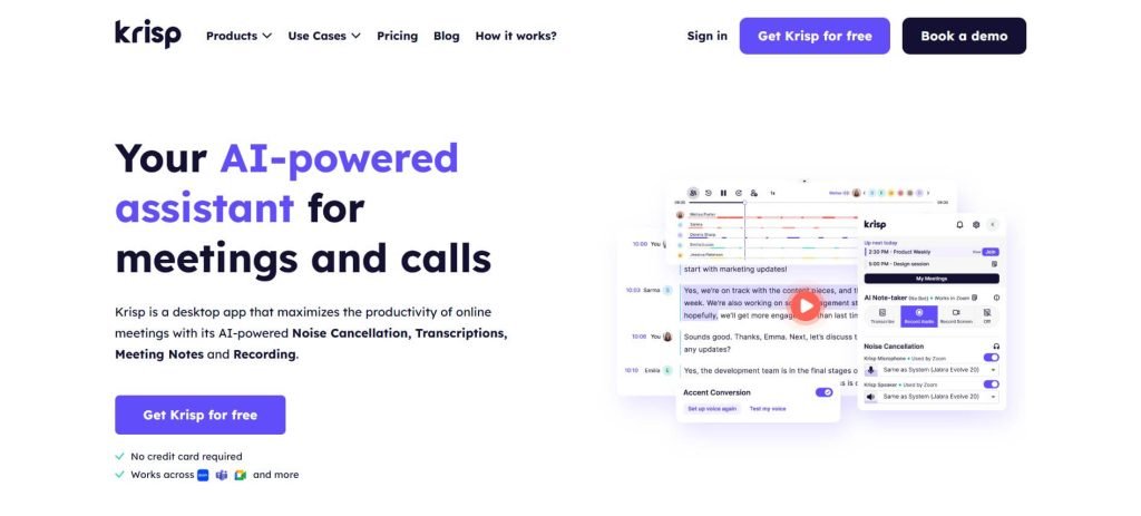 The problem is, that meetings can be troubled with background noise. Krisp uses AI to enhance audio quality and remove distractions while offering transcription features.
